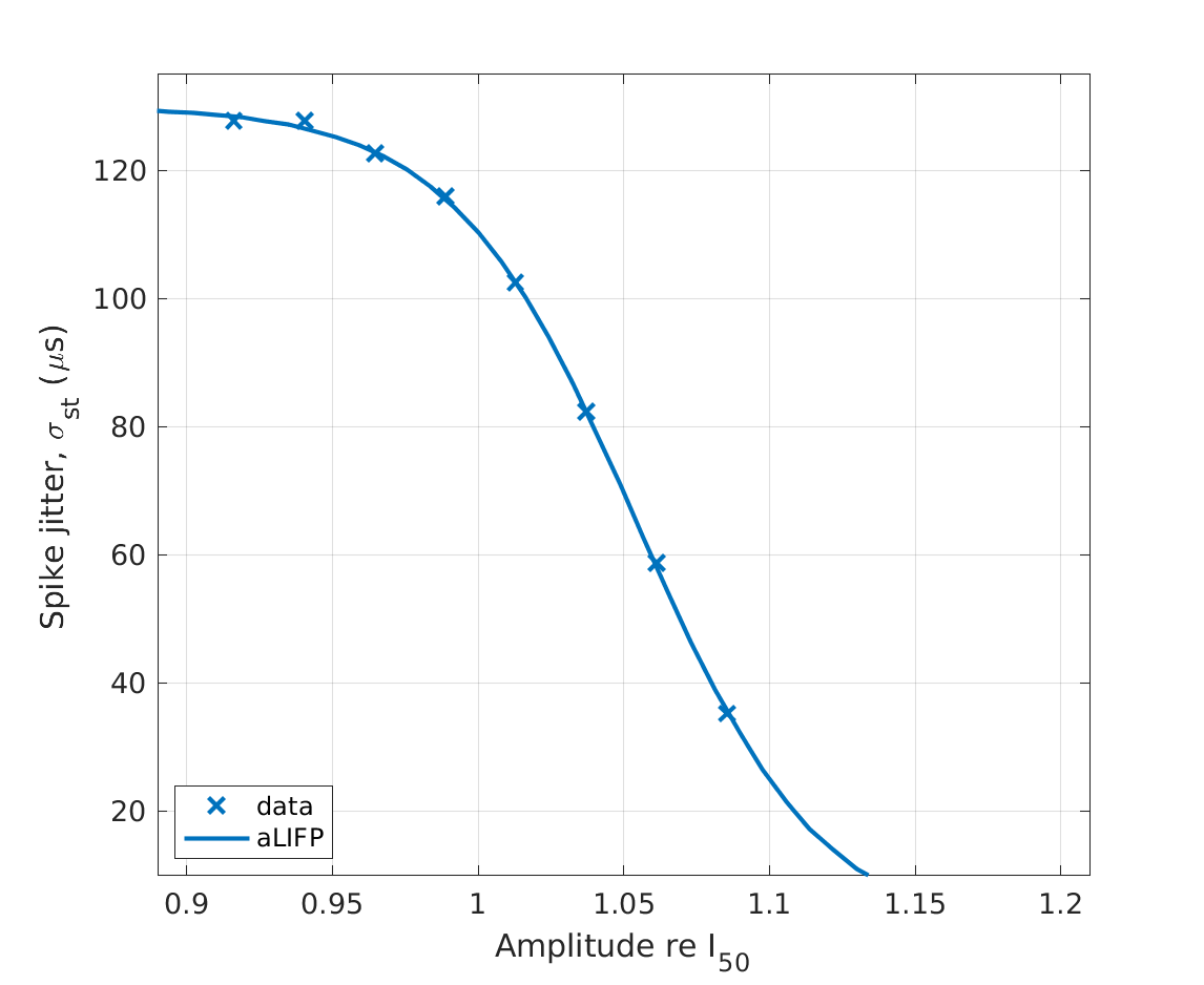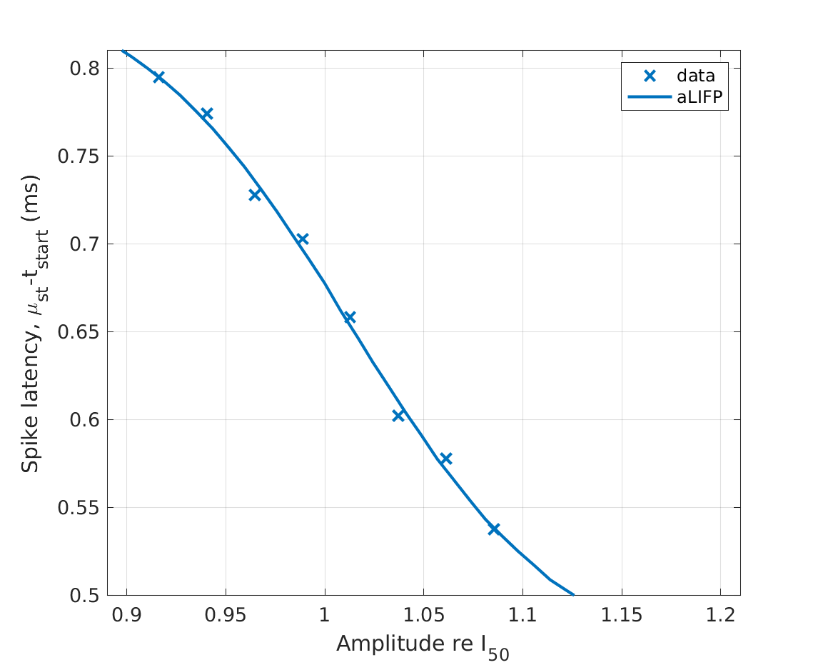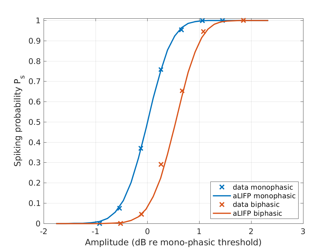| 'fig5b' | The spike probability for different amplitdues for mono- and biphasic pulses with a phase duration 100 \(\mu s\) and 0 \(\mu s\) IPG are shown. The figure shows both the predictions by the aLIFP model and the data recorded by Shepherd and Javel (1999) from a single cat auditory nerve fiber. |