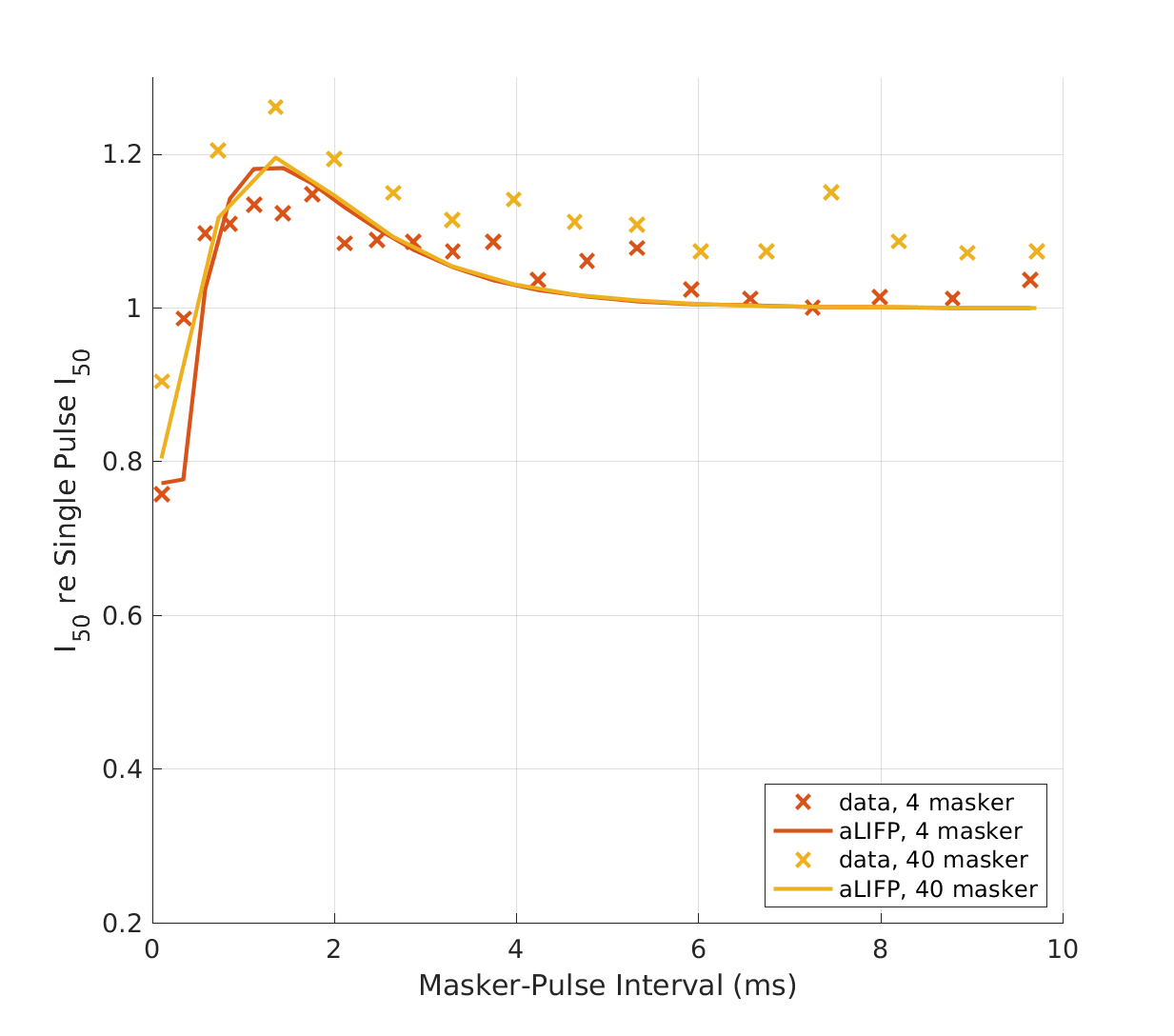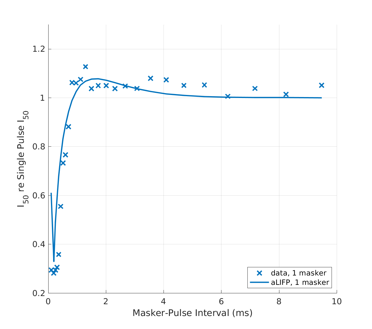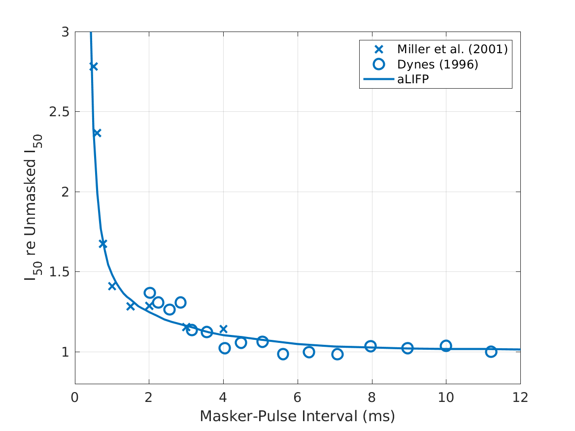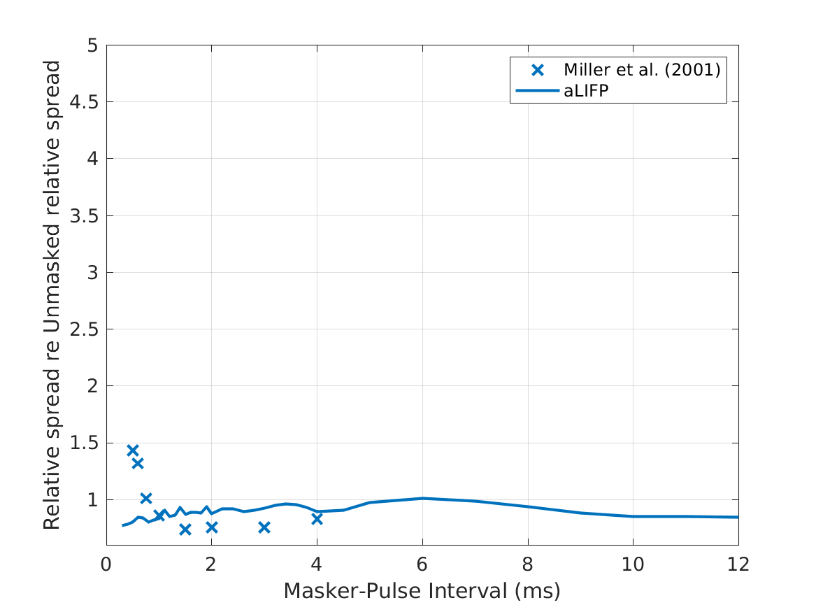 | 'fig10' | Data collected by Miller et al. (2011), who measured the impact of a low amplitude stimulus on a subsequent probe in 48 cat nerve fibers. The amplitudes were placed around the spike threshold for the masker, defined as the level where firing just started. |