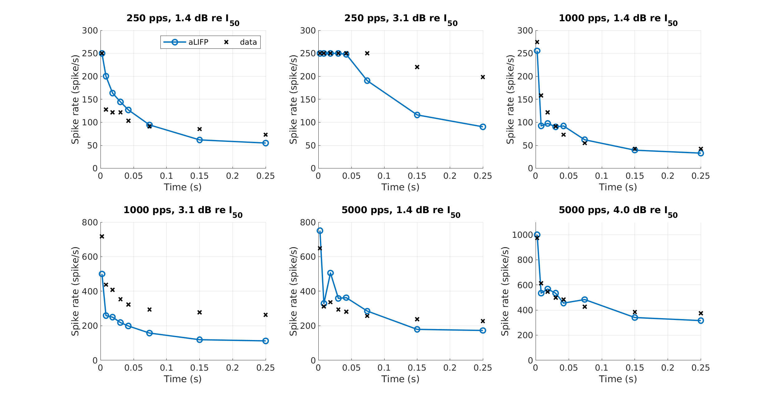| 'fig6e' | The spike rate adaptation for different pulse rates and amplitudes, as measured by Zhang et al. (2007). Our model was fitted at two amplitudes for each of the pulse rates 250 pps, 1000 pps, and 5000 pps. The low amplitude was always 1.4 dB re \(I_{50}\). For 250 pps and 1000 pps the high amplitude was 3.1 dB re \(I_{50}\) and for 5000 pps the high amplitude was 4.0 dB re \(I_{50}\). Note the slightly higher second amplitude for 5000 pps, which was used according to the data. . |