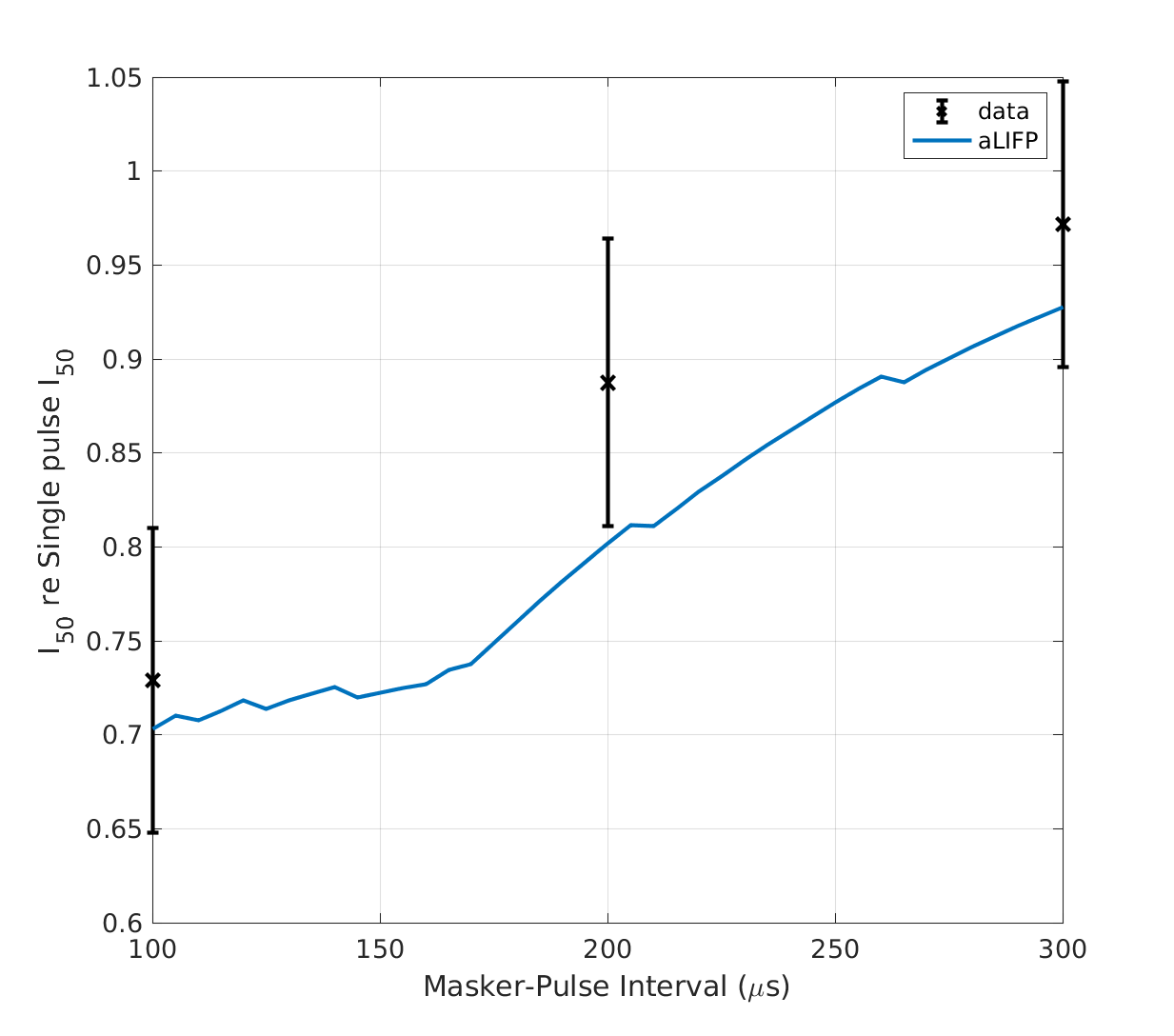 | 'fig7' | The decrease in threshold due to facilitation is measured by Cartee et al. (2000) by dividing the \(I_{50}\) of two pseudo-monophasic pulses by the \(I_{50}\) of a single of these pulses. The data was collected by Cartee et al. (2000) using 38 cat nerve fibers and is compared to predictions of the aLIFP model. |