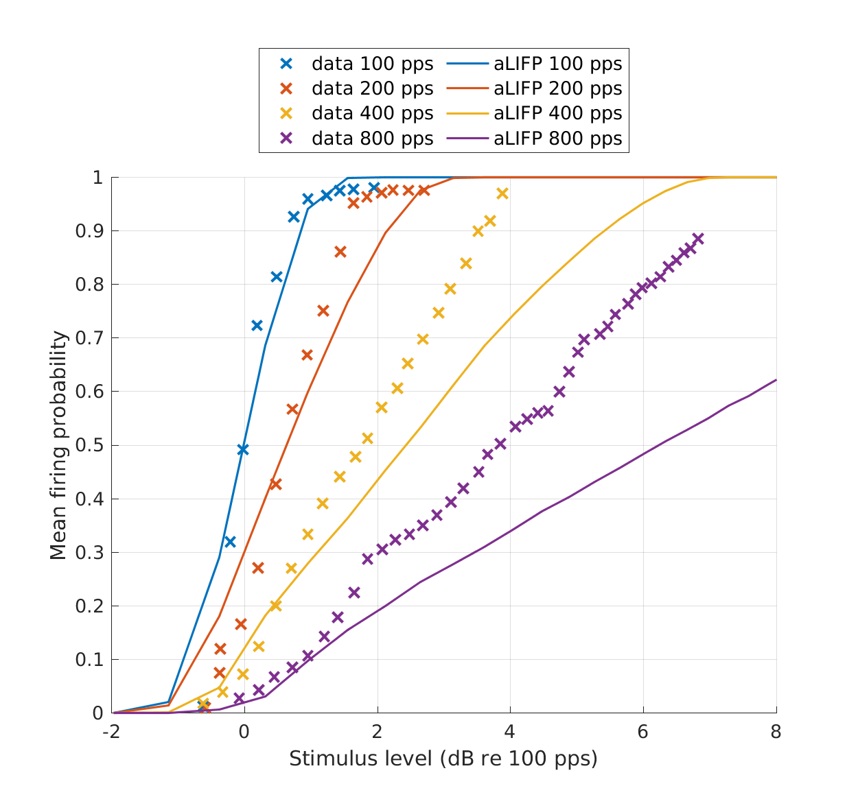 | 'fig9' | Mean firing probability over level for four 100 \(\mu s\) pulse trains with different pulse rates. The x-axes give the amplitude in dB re \(I_{50}\) at 100 pps. The data were collected on a single cat nerve fiber by Javel (1990) and simulated using the aLIFP model. |