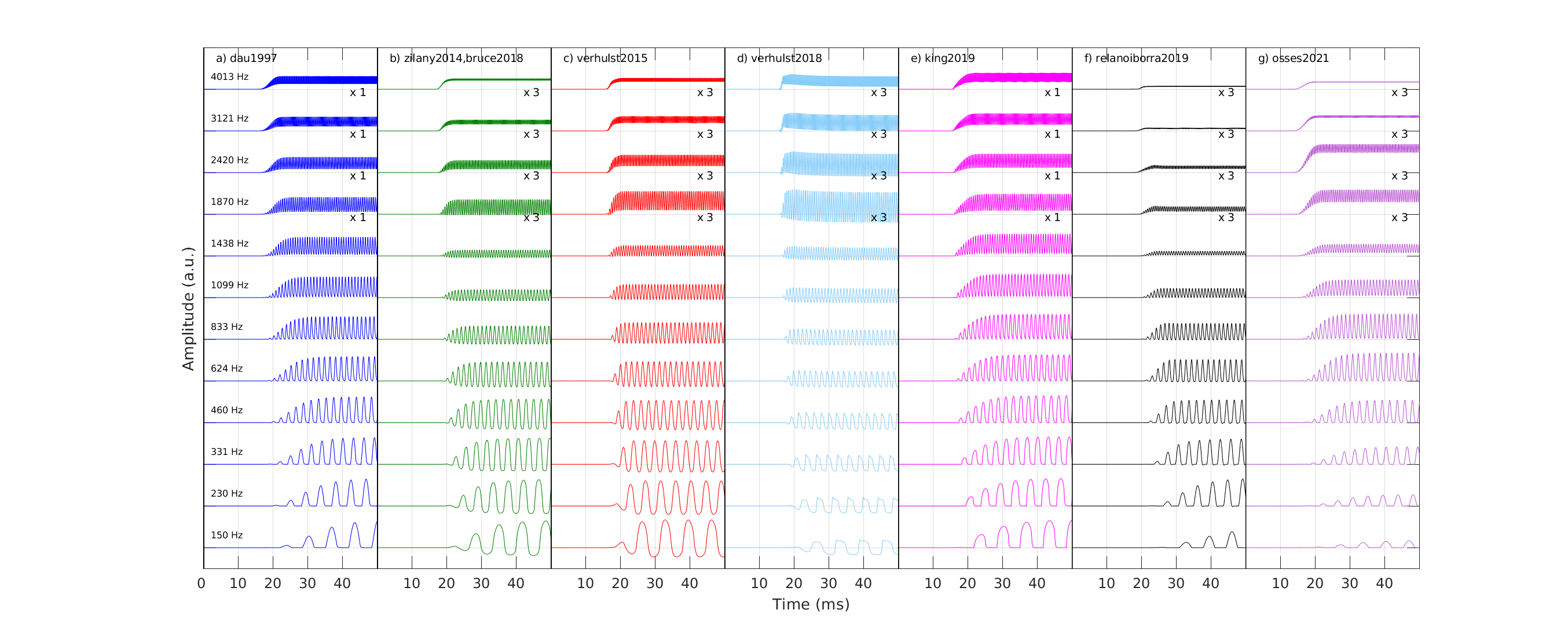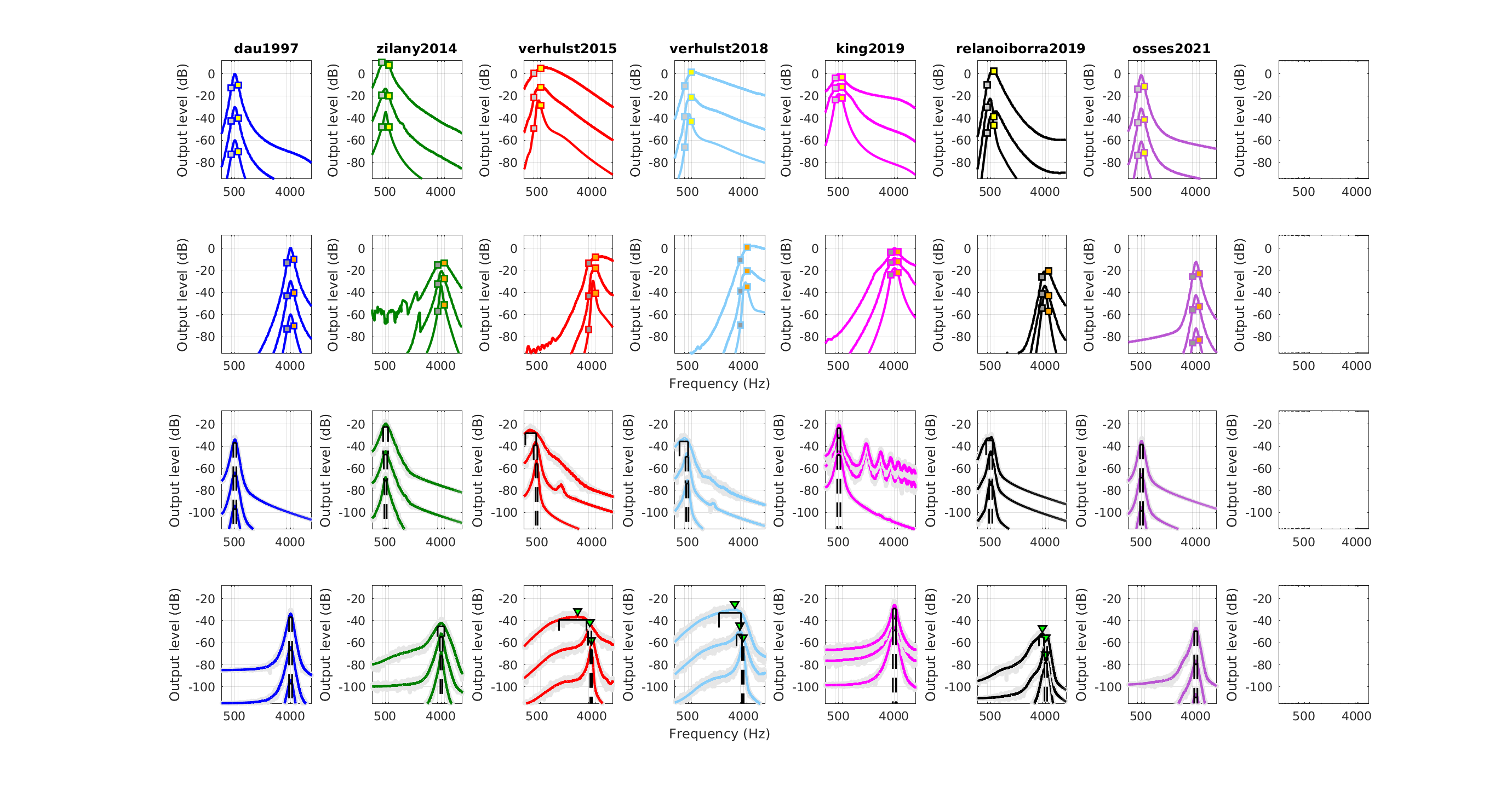 exp_osses2022(..., 'models', models) can be used to show data for specific models only. To this end, models is a vector selecting the models by the index as show in the list above. For example if models is [1 3 6] then the data for Dau et al., (1997), Verhulst et al., (2015), and King et al., (2019) will be shown only.